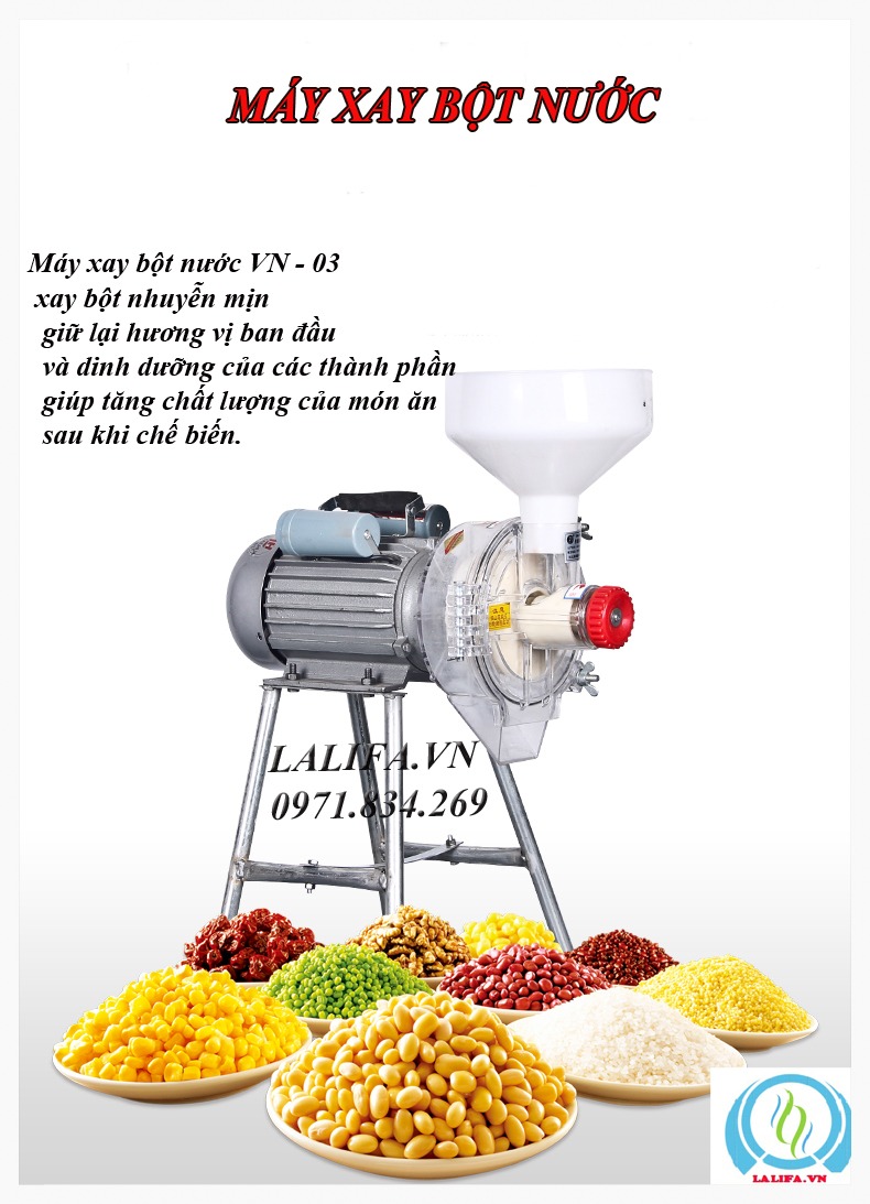 Máy Xay Bột Nước VN - 03 thuộc dòng máy nghiền đa năng, được dùng để xay nghiền các loại bột khô như bột đỗ đen, đỗ xanh, ngô, gạo, đậu đỏ…; xay các loại ngũ cốc đã được ngâm nước để làm bột ướt; xay các vị thuốc bắc như: bạch chỉ, nhũ hương, các loại lá khô. Đặc biệt máy còn được sử dụng để nghiền các loại bột nghệ, bột gừng từ những lát nghệ, gừng đã được thái mỏng.